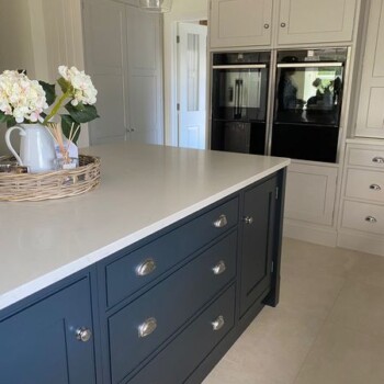 - Kitchen cupboards painted in Farrow & Ball Cornforth White